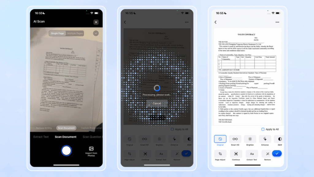 Escaneo múltiple en ráfaga: Ya sean libros de texto voluminosos, contratos de varias páginas o apuntes sueltos, puedes digitalizar todo de una sola vez con el modo ráfaga de Escaneo con IA.