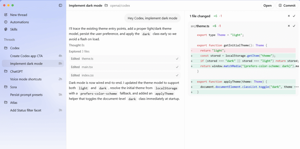 A diferencia de los asistentes basados únicamente en chat, la aplicación Codex está pensada para gestionar tareas complejas de manera continua. Permite ejecutar y supervisar varios agentes de IA de forma simultánea, cada uno dedicado a distintas funciones dentro de un mismo proyecto. Estos agentes pueden trabajar durante largos períodos, escribir y ejecutar código, y automatizar procesos de análisis y tratamiento de datos sin requerir intervención constante del usuario.
