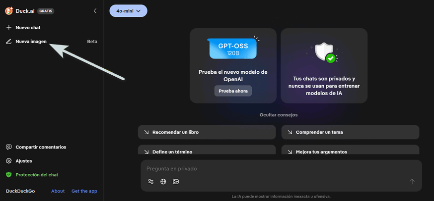 La herramienta está disponible en el sitio web de Duck.ai. Para empezar, basta con elegir la opción “Nueva imagen” en la barra lateral y escribir la descripción deseada. El proceso es sencillo y mantiene las mismas garantías que los chats habituales: las indicaciones se anonimizan, no se emplean para entrenar el modelo de OpenAI que hay detrás y las imágenes generadas se guardan únicamente en el dispositivo del usuario, no en los servidores de DuckDuckGo. Además, todas las creaciones se identifican claramente como contenido generado por IA siguiendo el estándar C2PA.
