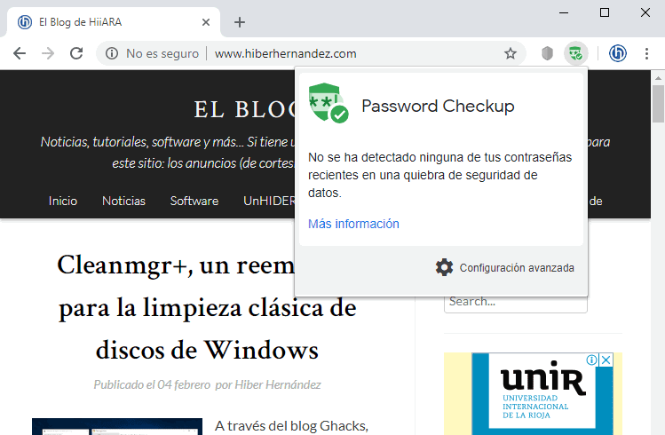 Password Checkup es una extensión de Google Chrome y disponible para su navegador web, detecta si un nombre de usuario y contraseña han sido comprometidos en los últimos años.
