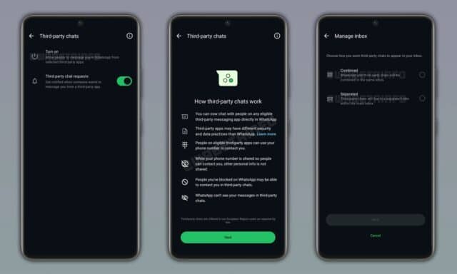 Los chats de terceros en WhatsApp admitirán funciones esenciales como enviar mensajes, fotos, videos, mensajes de voz y documentos. Los usuarios pueden gestionar los mensajes entrantes utilizando una bandeja de entrada combinada o separada, según sus preferencias. Las opciones de personalización incluyen notificaciones push, calidad de carga de medios y alertas en la aplicación para adaptar la experiencia. Si bien ciertas funciones nativas, como actualizaciones de estado, pegatinas y mensajes que desaparecen, no son compatibles, WhatsApp garantiza un sistema de comunicación multiplataforma simple y seguro.