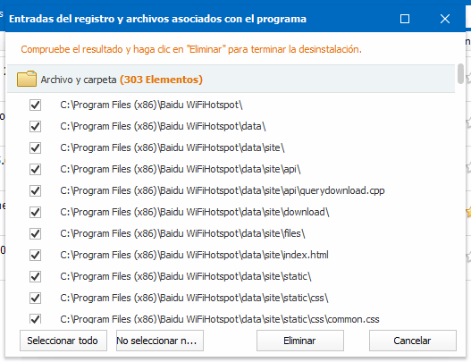 Sea cual sea la opción a elegir ya sea de modo seguro o modo forzado, WPU elimina archivos, iconos, claves en el registro de Windows y todos los restos del programa a desinstalar, tal y como se ve en la siguiente captura: