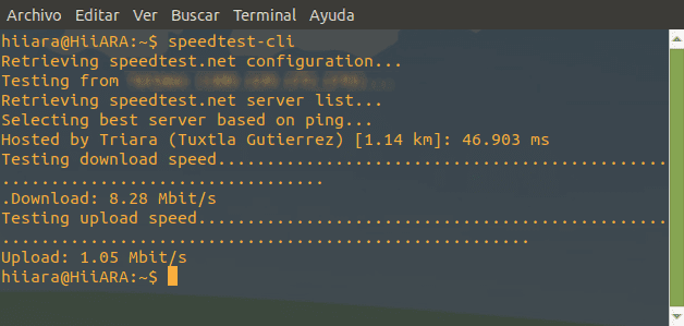 Una vez haya instalado, ejecute speedtest-cli en su terminal, y verá como va desglosando la información necesaria para saber la velocidad de carga y descarga de su servicio de Internet.