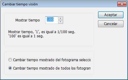 Configurar el tiempo de visión de imagen a imagen. Donde el valor 100 equivale a 1 segundo. Podemos asignarle un tiempo específico por imagen, o el tiempo asignado para todos los fotogramas.