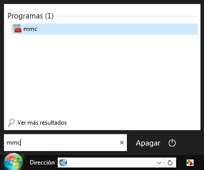 Desde la ventana ejecutar o desde el menú inicio escribimos mmc y pulsamos enter.